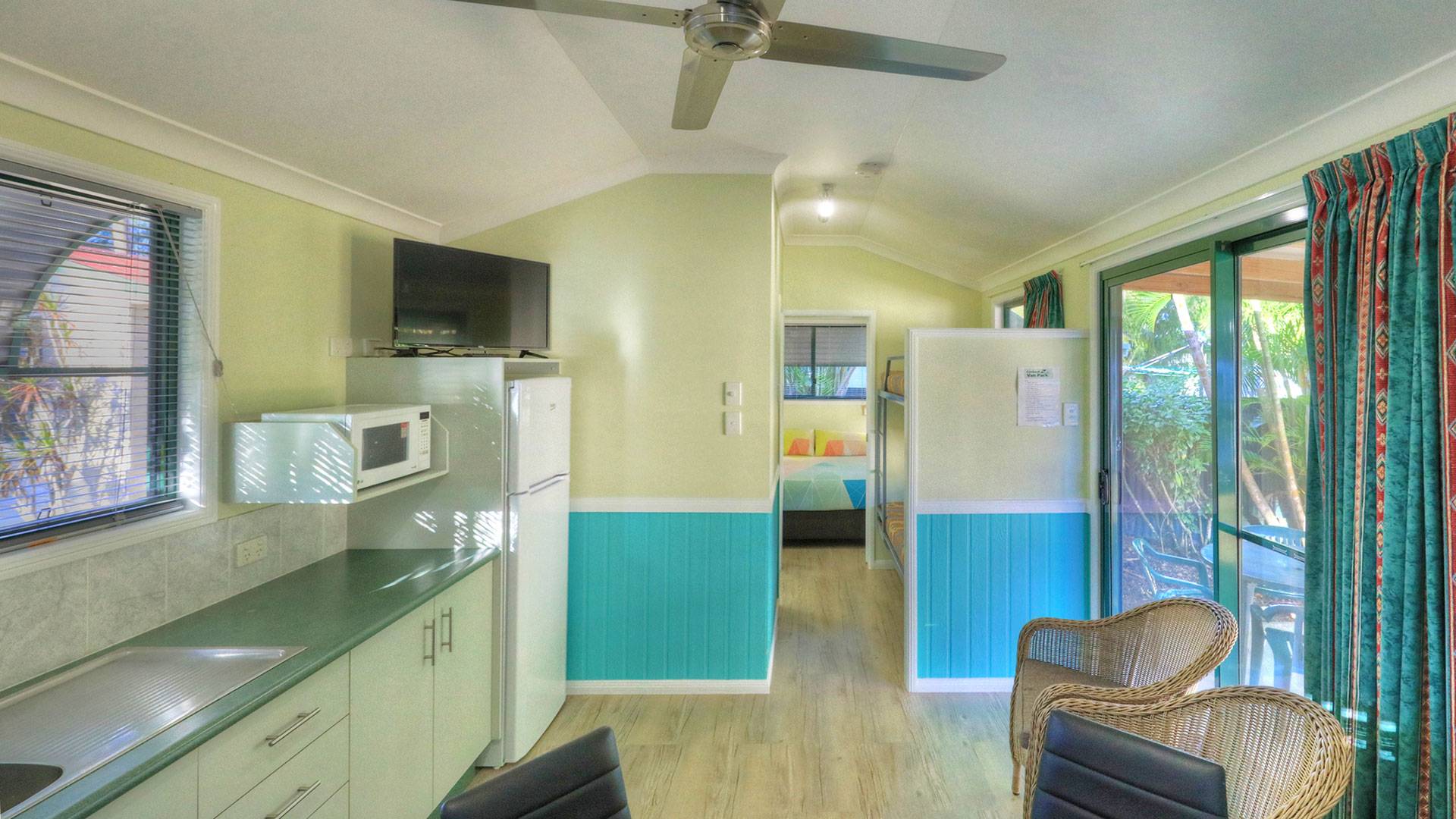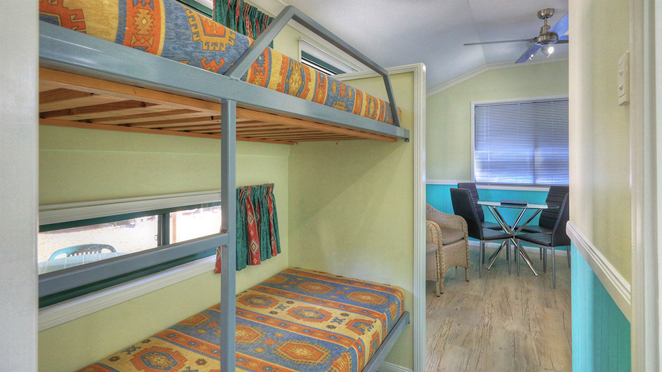 Our One Bedroom Ensuite Cabin has all the things to make your stay comfortable and enjoyable. A separate bedroom with its own smart TV and reverse cycle air conditioning, pillow topped double bed and overhead fan. There is a set of bunks in the centre and dining lounge area at the front with its own reverse cycle air conditioner and overhead fan.