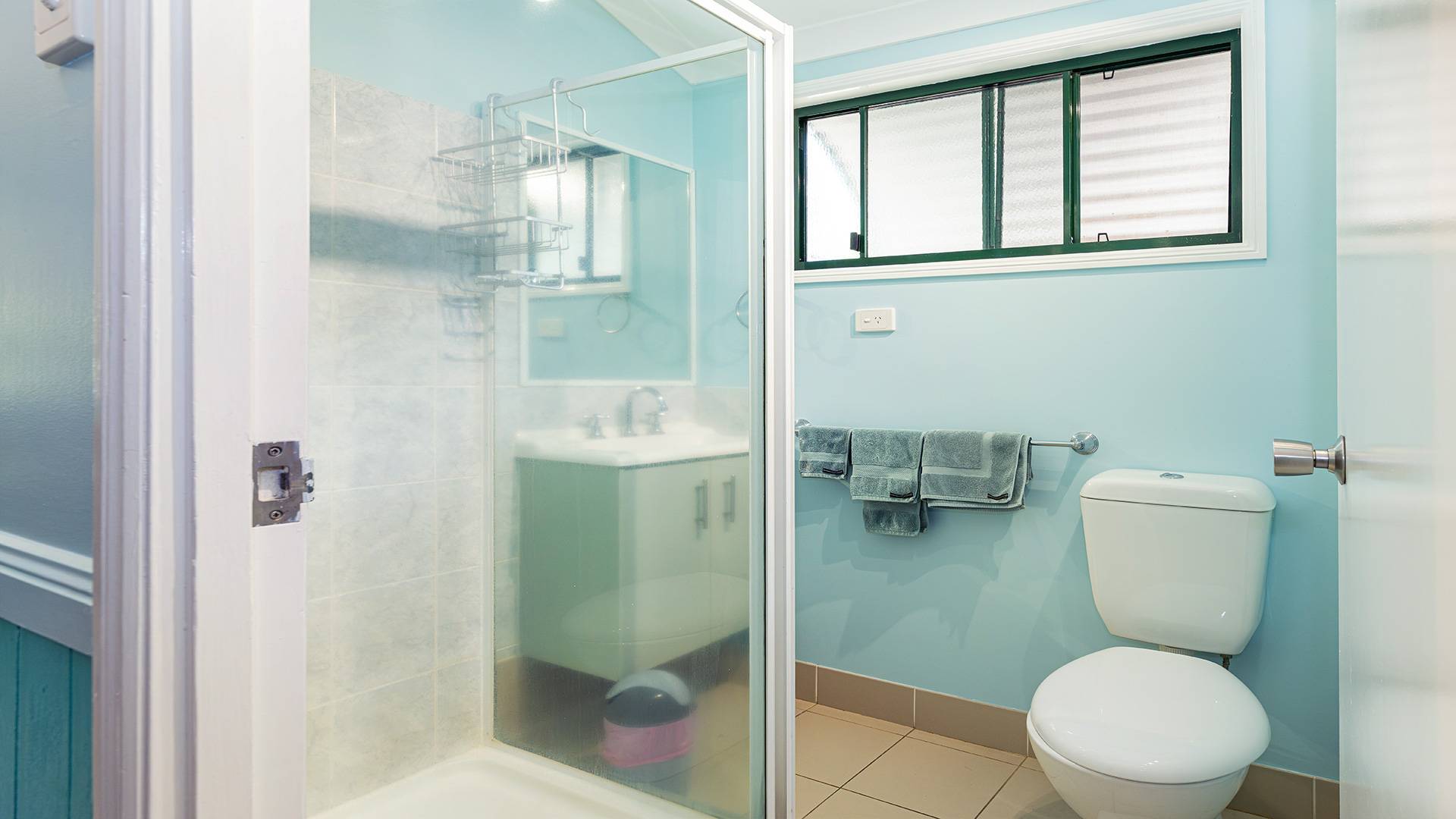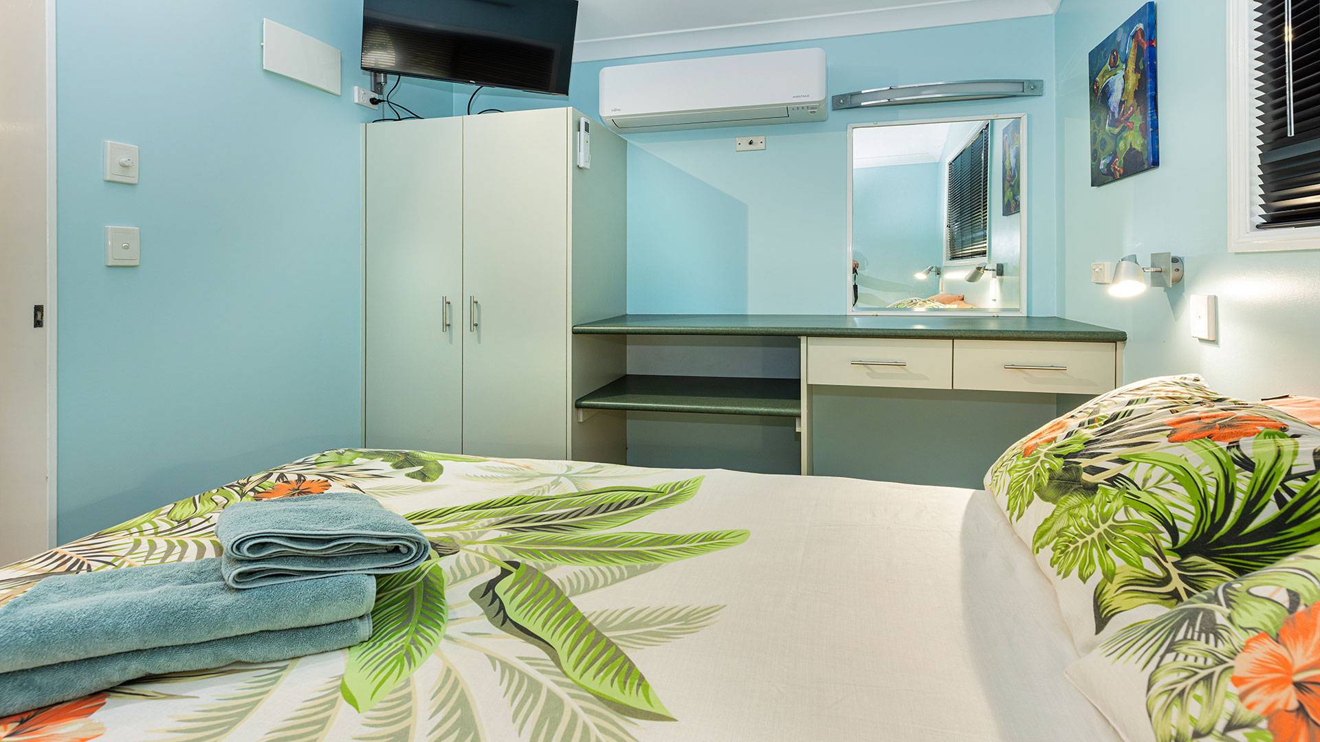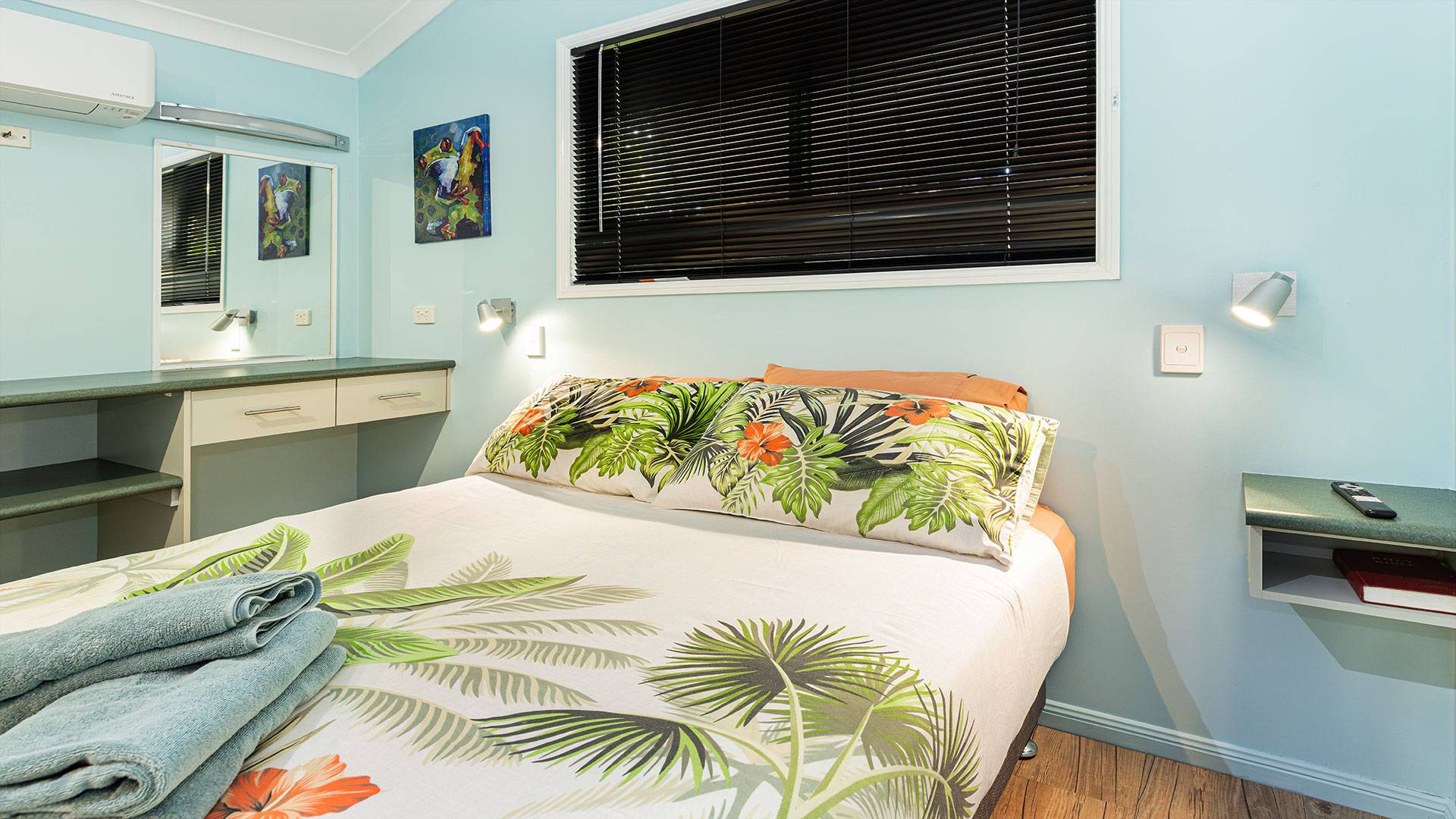 Our one bedroom ensuite cabin has all the things to make your stay comfortable and enjoyable. A separate bedroom with its own smart TV and reverse cycle air conditioning, pillow topped double bed and overhead fan. There is a set of bunks in the centre and dining lounge area at the front with its own reverse cycle air conditioner and overhead fan.