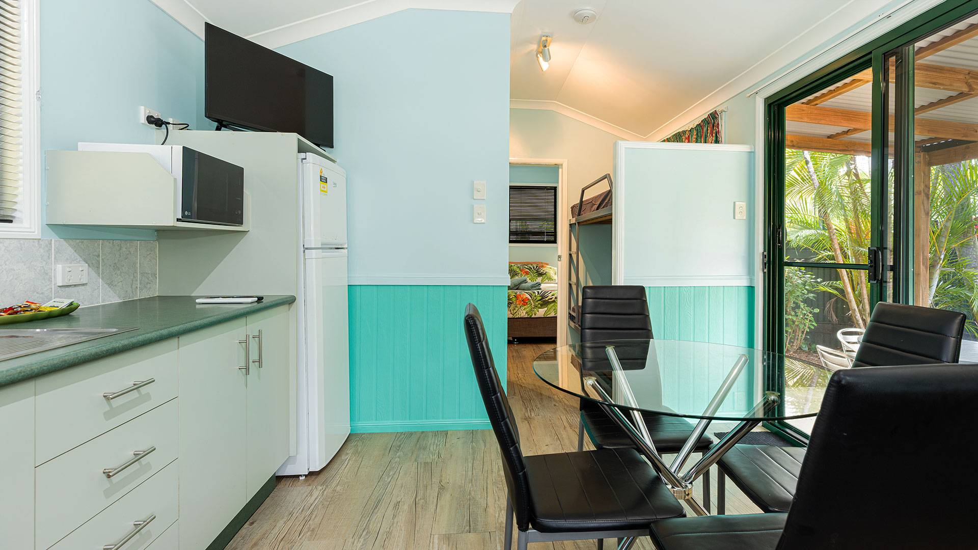 - Fully equipped kitchenette: Cook up your own meals with ease. Cabins come equipped with two burner electric cooktop, electric frypan, kettle, toaster, two door 220 litre fridge, coffee machine, range hood and all the bits and pieces needed to conjure up your tropical feast.