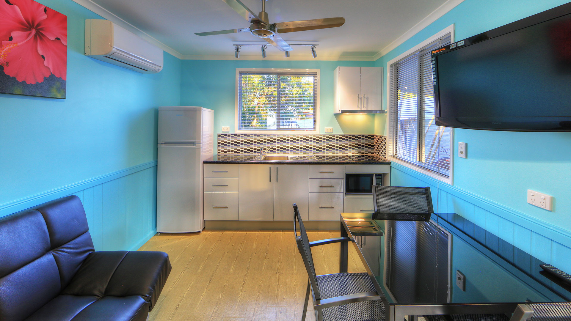 - Fully equipped kitchenette: Cook up your own meals with ease. Cabins come equipped with two burner electric cooktop, electric frypan, kettle, toaster, two door 220 litre fridge, coffee machine, range hood and all the bits and pieces needed to conjure up your tropical feast.